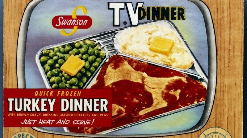 Back in 1953, Swanson overestimated Thanksgiving demand and found themselves with 260 tons of leftover turkey. Their solution? Pack turkey, cornbread stuffing, peas, and sweet potatoes into a neat aluminum tray designed to be heated in the oven. Voilà, the TV dinner was born, perfectly timed for America's obsession with the living room television.